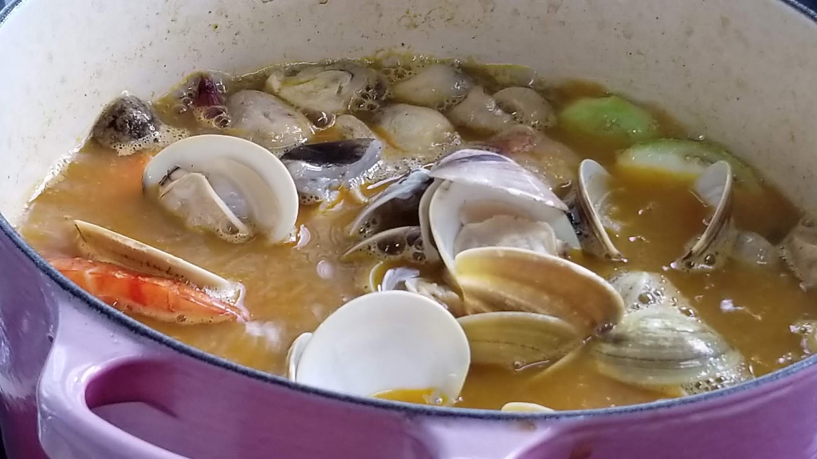 6. 再將鮮蝦、花甲及草菇加入湯中。